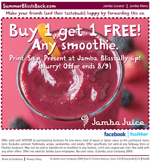 CLICK HERE to get a B1G1 Free Smoothie (any smoothie) coupon to use at your local Jamba Juice! This is such a wonderful coupon for our family, because it’s Big Pea’s favorite place and we are there at least twice a week, so this will save some serious cash! Offer good thru August 9th.